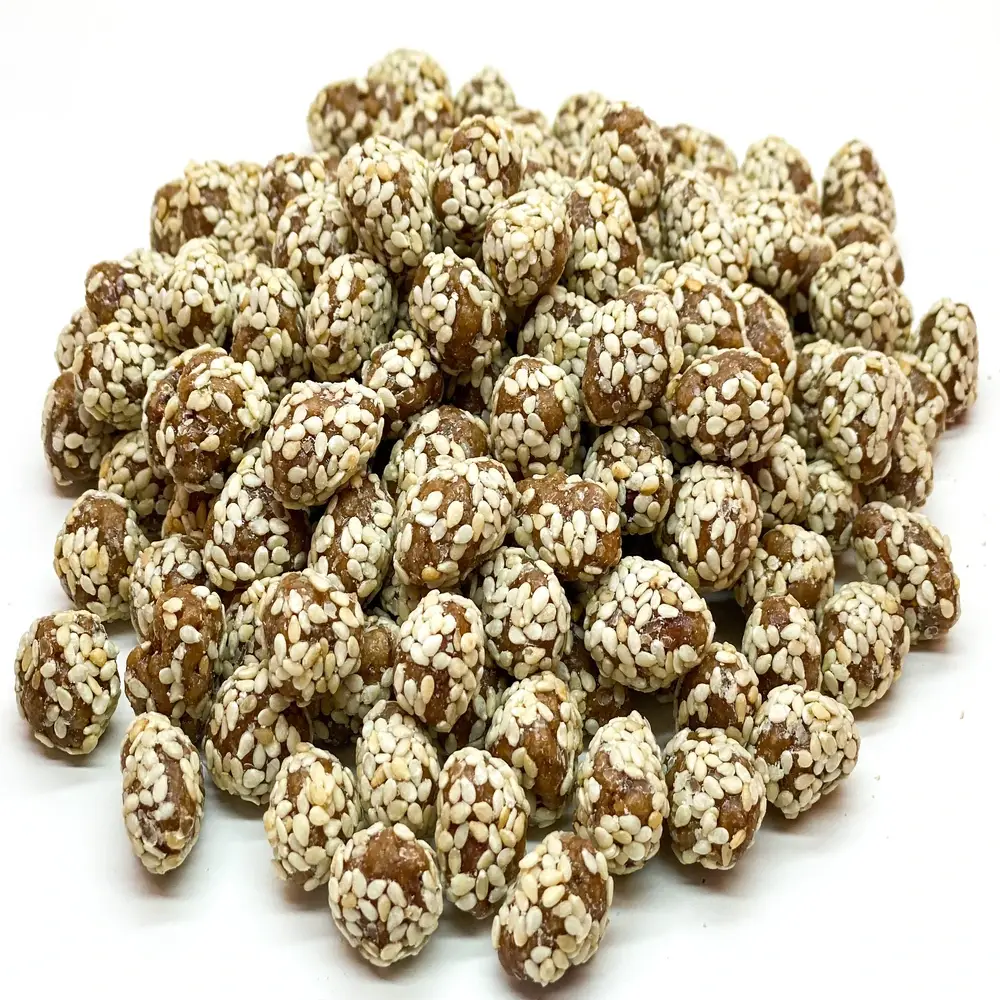 Арахіс в цукровій пудрі – це смачний і поживний продукт. Навіть після обсмажування в ньому зберігається вітамін Е – антиоксидант, який зупиняє процеси старіння клітин. При вживанні горіха поліпшується кровообіг, і знижується рівень холестерину в крові. У насінні кунжуту міститься величезна кількість кальцію, який необхідний для здоров’я зубів і кісток. Потрібно враховувати, що арахіс в кунжуті – калорійний продукт.